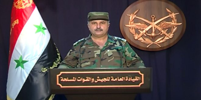وقالت القيادة العامة في بيان تلقت سانا نسخة منه اليوم “بتصميم كبير وثقة مطلقة بالنصر واصلت قواتنا المسلحة العاملة في شمالي حماة وجنوبي إدلب تقدمها الميداني ودحر التنظيمات الإرهابية المسلحة التي كانت تتمركز في المنطقة بعد تكبيدها خسائر فادحة في الأرواح والمعدات”.