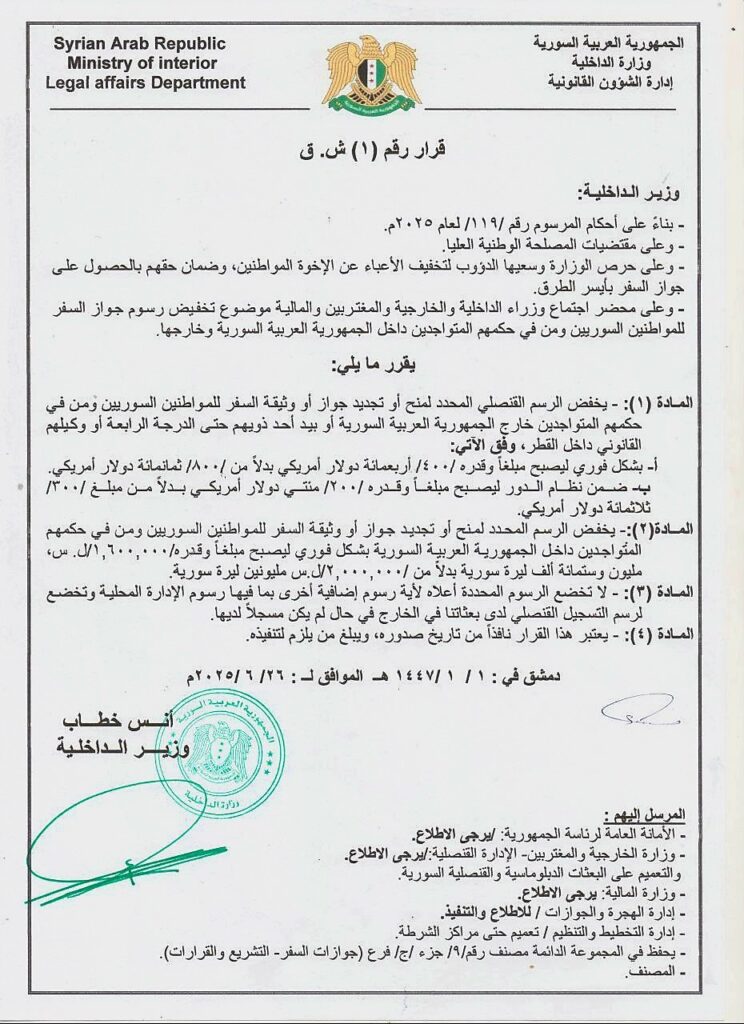 أصدر السيد وزير الداخلية السوري أنس خطاب القرار رقم (1 ش. ق) القاضي بتخفيض رسوم منح وتجديد جوازات ووثائق السفر للسوريين ومن في حكمهم داخل البلاد وخارجها، وذلك استناداً إلى أحكام المرسوم التشريعي رقم 119 لعام 2025، وحرصاً من الوزارة على تخفيف الأعباء المالية عن المواطنين وتسهيل إجراءات الحصول على الجواز.