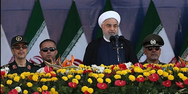 وقال روحاني خلال استعراض عسكري للقوات المسلحة الإيرانية جنوب طهران بمناسبة فعاليات أسبوع الدفاع المقدس.. “أينما حل الأمريكيون انتشرت الفوضى وعدم الاستقرار في حين استطاعت إيران القضاء على الإرهاب الذى حاولوا فرضه على دول المنطقة” مشيراً إلى وقوف بلاده إلى جانب الشعبين السوري والعراقي في استئصال جذور الإرهاب واستتباب الأمن في بلديهما.