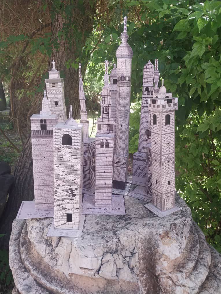 ماكيت مآذن سوريا, مئذنة جامع الجامعة الكبير جامع حارة السريا قلعة الحصن, حمص,مئذنة الجامع الأموي في دمشق,مئذنة جامع العمري في درعا,مئذنة جامع الأقرعي في إدلب, مئذنة الجامع الكبير في إدلب, مئذنة الجامع العمري في دير الزور,مئذنة الجامع الكبير في معرة النعمان,مئذنة الجامع الأموي في حلب ,مئذنة جامع خالد ابن الوليد في حمص.