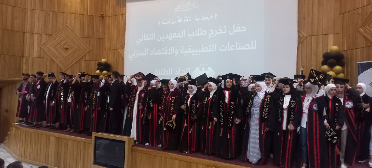 تتويجا لمسيرة علمية و بداية لانطلاقة مهنية واعدة، أقامت مديرية المعاهد التقانية بحمص بالتعاون مع اتحاد الطلبة بجامعة حمص اليوم حفل تخرج طلاب معهدي الصناعات التطبيقية و الاقتصاد المنزلي للعام الدراسي ٢٠٢٤_٢٠٢٥ على مدرج كلية الآداب الكبير.