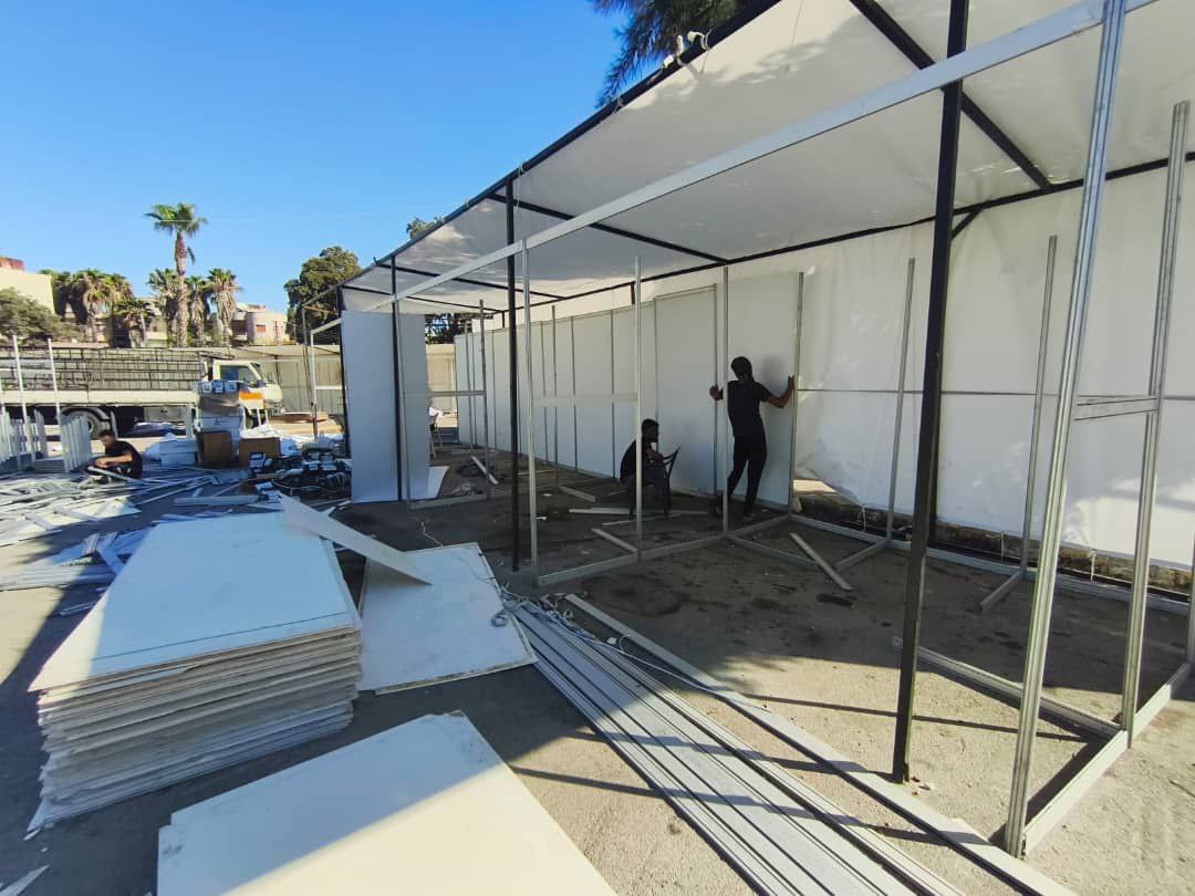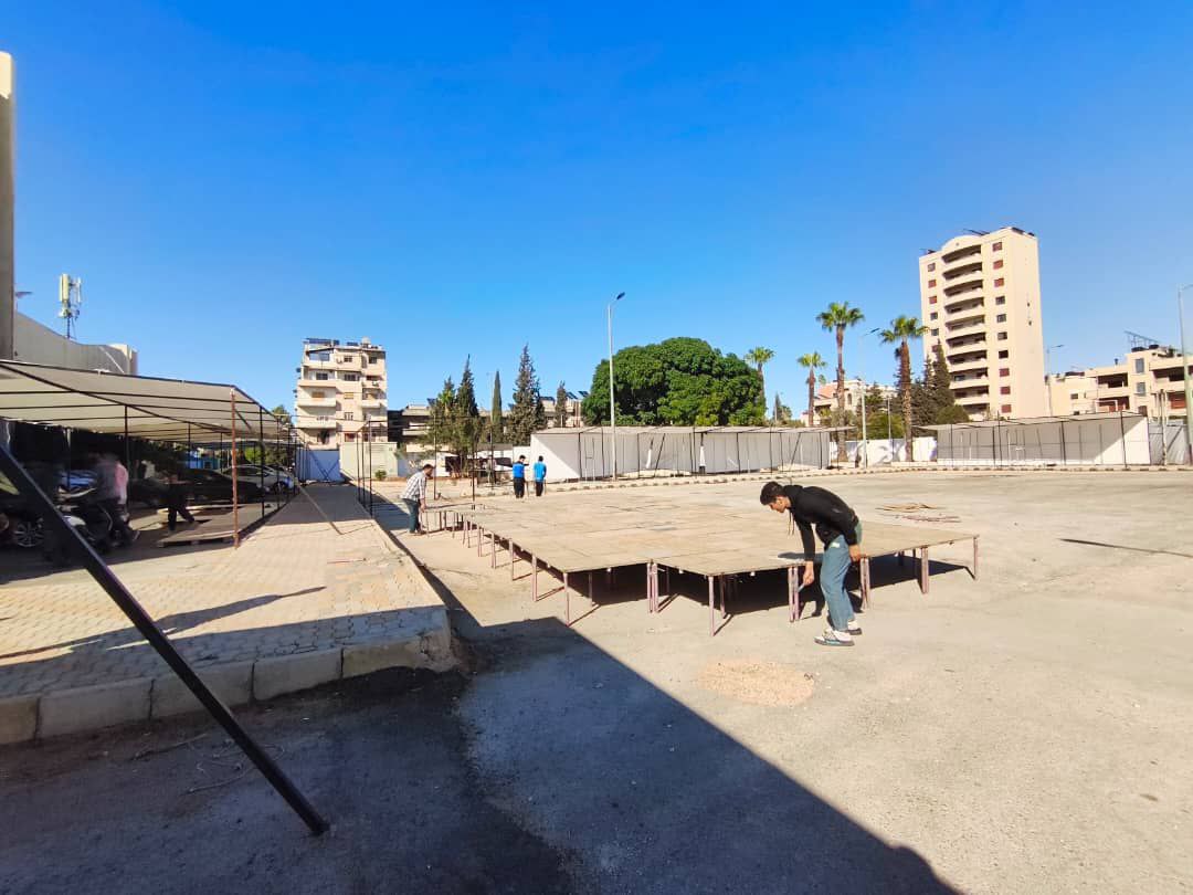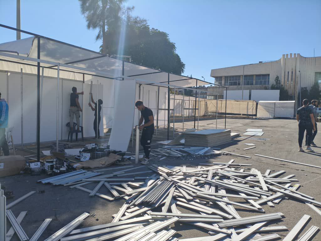 تتسارع وتيرة العمل لإنهاء التحضيرات اللوجستية وبناء الأجنحة المخصصة للشركات المشاركة في مهرجان السلام الذي تقيمه محافظة حمص يوم غد الأربعاء الساعة 6 مساء في ساحة المحطة .