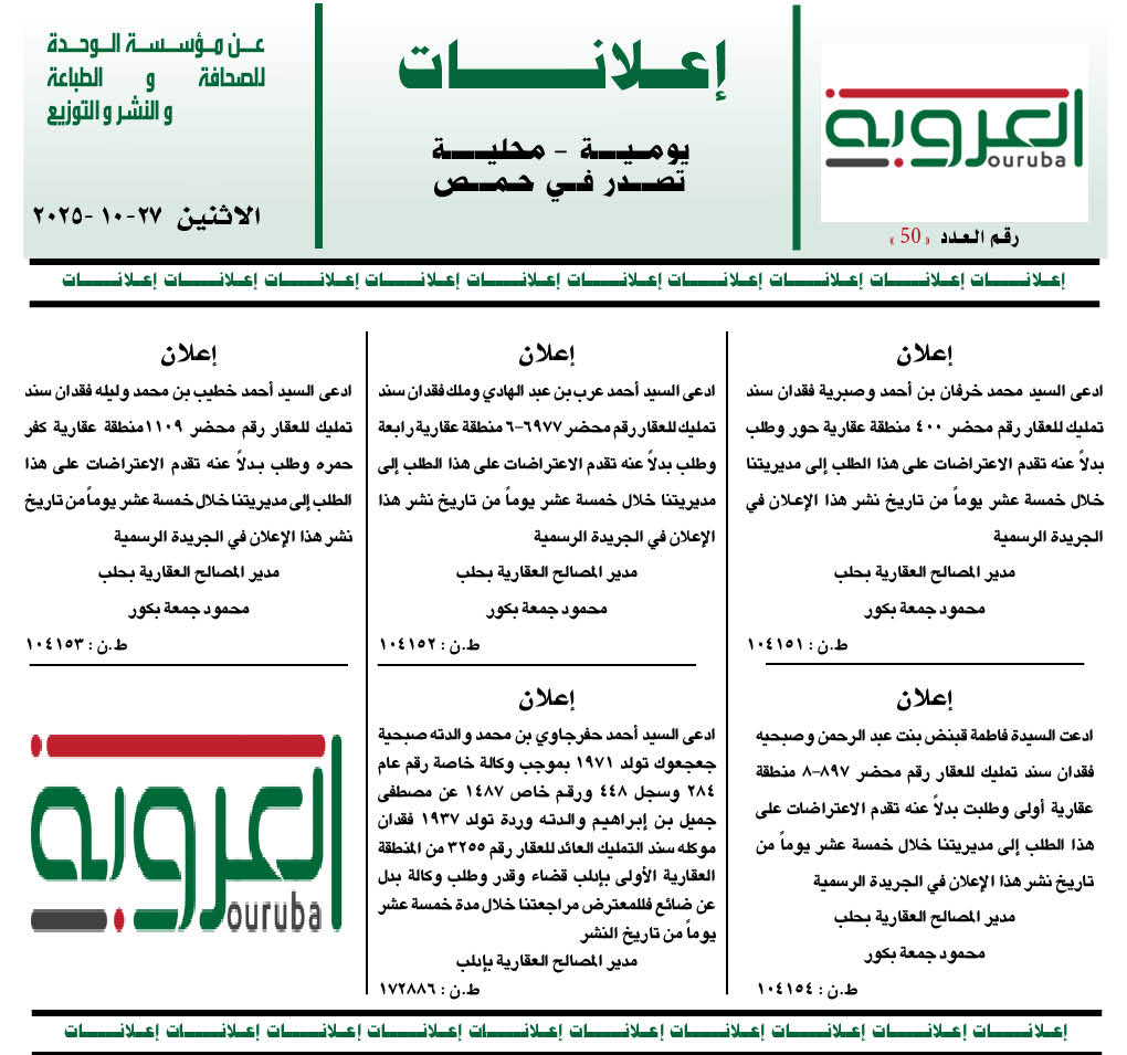 إعلانات العروبة إعلانات آخر تحديث 27 تشرين أول , 2025 شارك FacebookWhatsAppFacebook MessengerTelegramTwitter