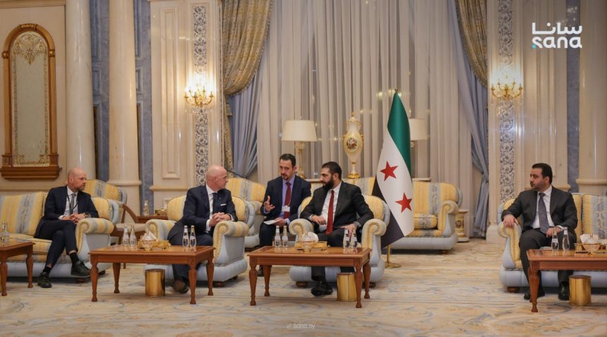 الرئيس الشرع يعقد لقاءً مع رئيس الاتحاد الدولي لكرة القدم أحدث الأخبارأخبار العروبةرئيسي في 28 تشرين أول , 2025 عقد رئيس الجمهورية العربية السورية أحمد الشرع اليوم لقاءً مع رئيس الاتحاد الدولي لكرة القدم (FIFA) جياني إنفانتينو. وجرى اللقاء بحضور وزير الخارجية والمغتربين أسعد حسن الشيباني، وذلك على هامش مؤتمر مبادرة مستقبل الاستثمار في الرياض. شارك FacebookWhatsAppFacebook MessengerTelegramTwitter