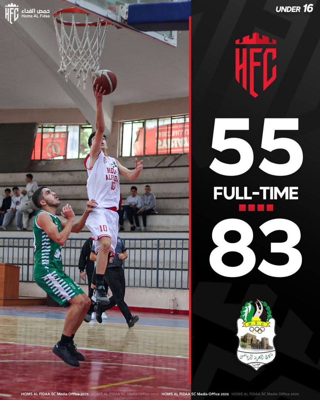 ضمن منافسات الجولة الثانية من منافسات ذهاب الدوري السوري بكرة السلة تحت 16 عاما خسر ناشئو حمص الفداء أمام ناشئي الحرية بفارق 28 نقطة في المباراة التي جمعتهما على أرض صالة غزوان أبو زيد بحمص النصف الأول من المباراة انتهى لصالح حمص الفداء بفارق نقطتين 31 حمص الفداء مقابل 29 للحرية .