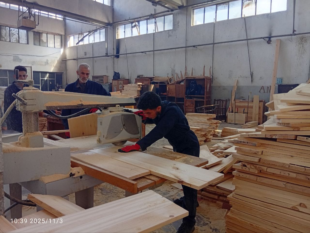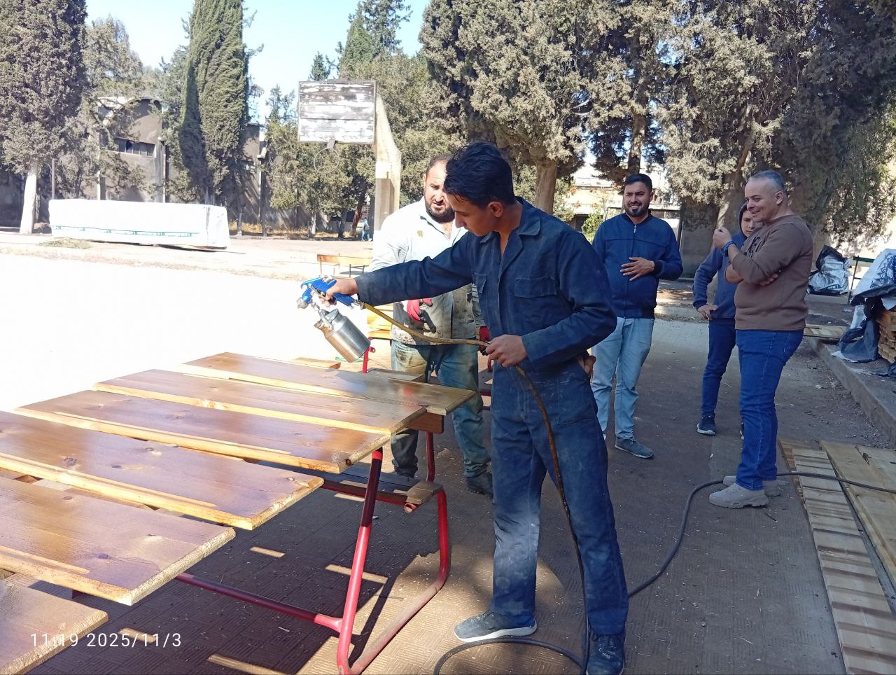 و مع بداية العام الدراسي تم تزويد مديرية التربية بكميات وفيرة من الخشب، حيث قامت المديرية بتكليفنا على إعادة هيكلة وتصنيع الهياكل المعدنية القديمة في جميع مدارس حمص، وهذا المشروع أعطى حيوية كبيرة لحرفة اللحام والتشكيل والنجارة، لتهيئ الطالب الدخول لسوق العمل، بالإضافة إلى صرف أجور المعلمين والطلاب من هذا المشروع، والذي خلق بدوره روح العمل والتنافس ما بين الطلاب.