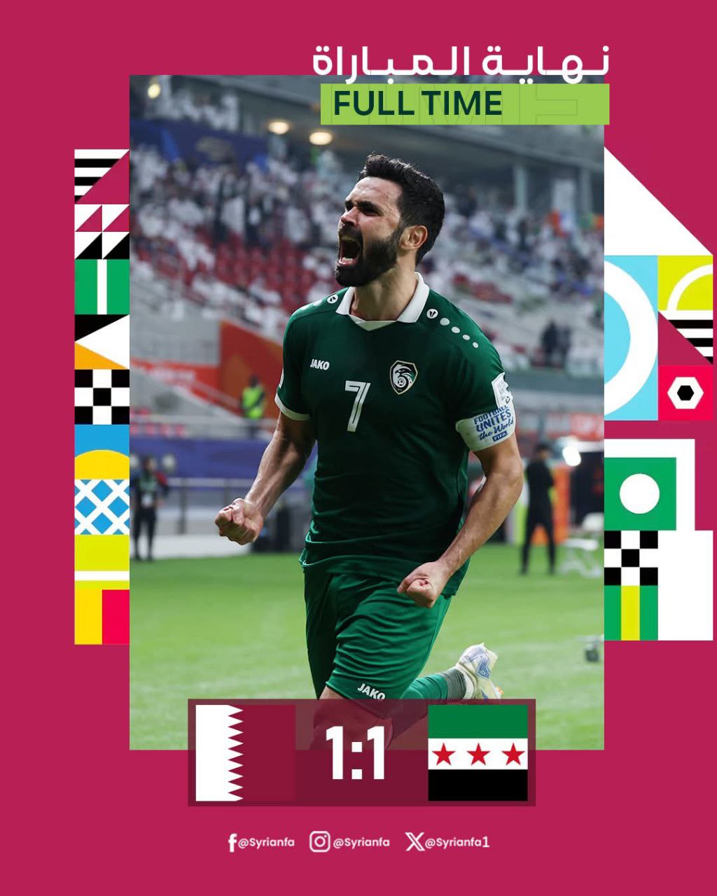 في الشوط الثاني دخل القطريون مصممين على مصالحة جمهورهم وكسب نقاط المباراة لإعادة الأمل بالتأهل للدور الثاني من البطولة لاسيما وأنهم خسروا أولى مبارياتهم أمام منتخب فلسطين المثابر ، وضغط القطريون على مرمانا من كل الاتجاهات وكان لهم ما أرادوا من كرة رأسية سكنت شباكنا لينتفض لاعبونا ويضغطون على مرمى العنابي ومن هجمة مرتدة في الدقيقة الأخيرة من زمن المباراة وصلت إلى عمر خريبين سدد كرة صاروخية عجز حارس العنابي عن صدها لتسكن شباكه وتعطي التعادل لنسور قاسيون ، بعد الهدف حاول القطريون تسجيل هدف الفوز وكادوا أن ينجحوا بذلك لولا تألق حارسنا الذي أبعدها لركنية ليعلن بعدها حكم المباراة نهاية اللقاء بالتعادل الإيجابي بهدف لهدف .