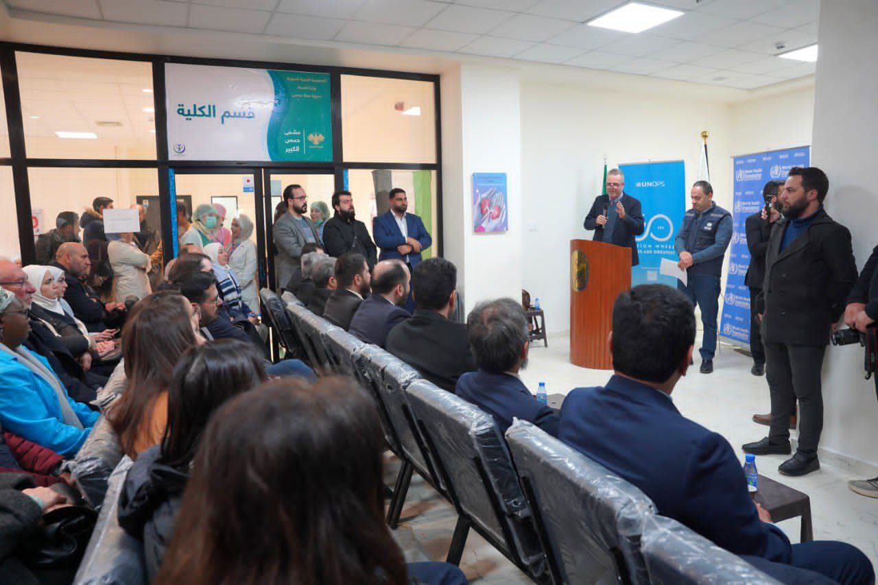 وتضمنت الجولة افتتاح مبنى الكلية في مشفى حمص الكبير، والذي أُنجز بدعم من الحكومة اليابانية وبالتعاون مع منظمة الصحة العالمية وبرنامج الأمم المتحدة الإنمائي UNOPS، حيث يضم 22 جهازاً لغسيل الكلى و30 سريراً، إضافة إلى غرف عمليات وتجهيزات تشخيصية حديثة، ما يساهم في تخفيف الضغط عن المرضى وتحسين مستوى الرعاية المقدّمة لمرضى القصور الكلوي.