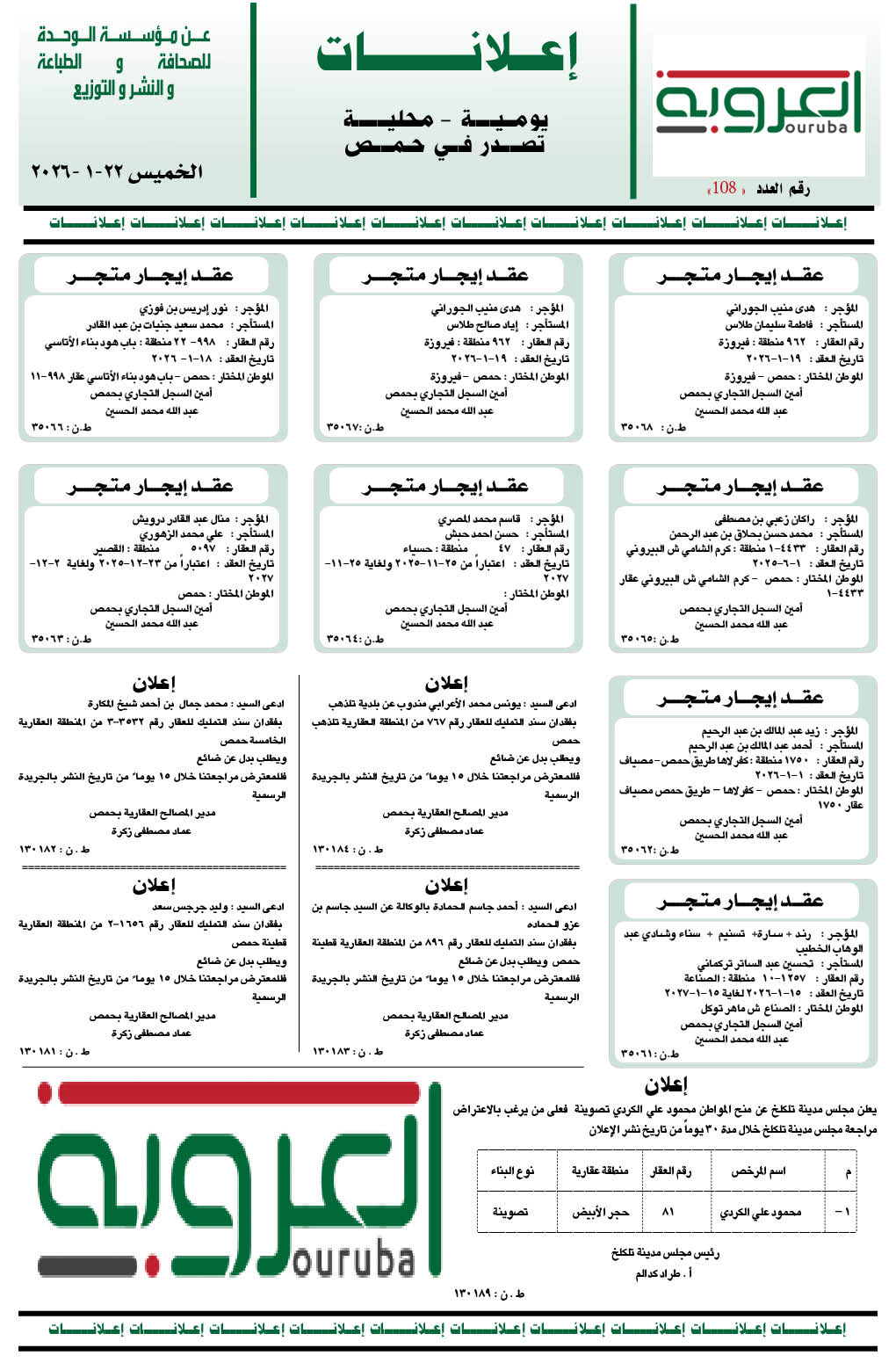 إعلانات العروبة إعلانات في 22 كانون الثاني , 2026 شارك FacebookWhatsAppFacebook MessengerTelegramTwitter