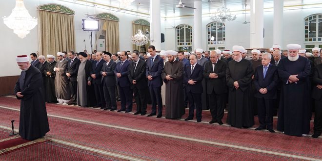 شارك السيد الرئيس بشار الأسد بالاحتفال الديني الذي أقامته وزارة الأوقاف ظهر اليوم بذكرى مولد الرسول الكريم محمد صلى الله عليه وسلم في رحاب جامع المرابط بدمشق حيث أدى صلاة الظهر مؤتماً بفضيلة الشيخ عبد الفتاح البزم مفتي دمشق.