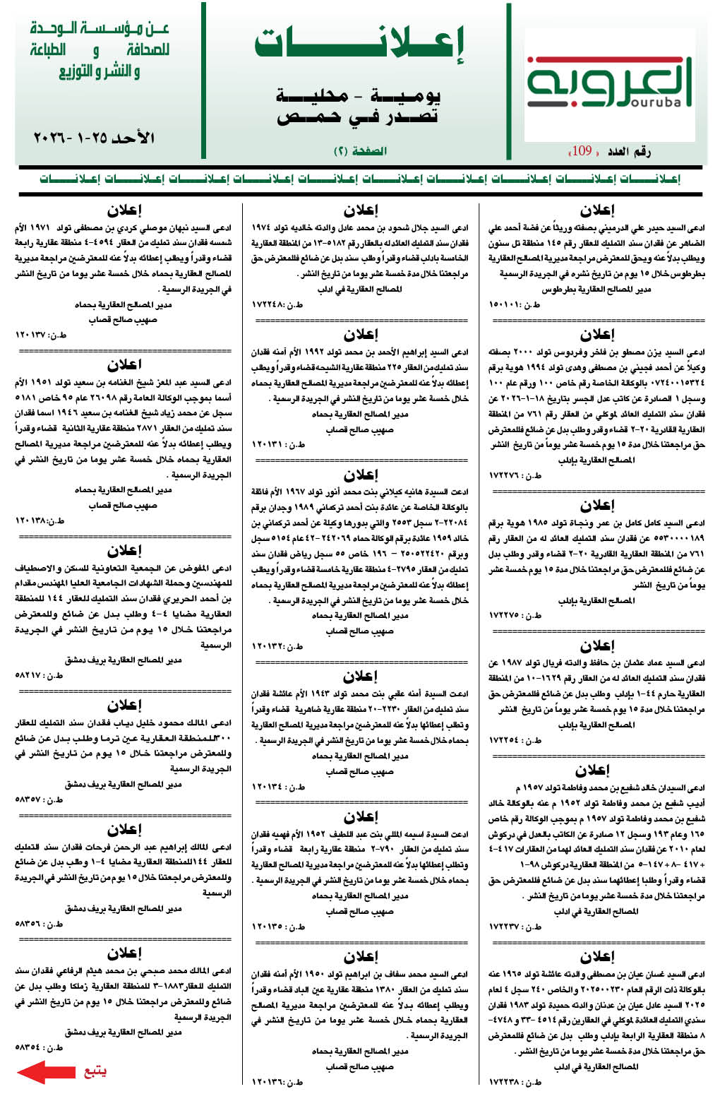 إعلانات العروبة إعلانات في 25 كانون الثاني , 2026 شارك FacebookWhatsAppFacebook MessengerTelegramTwitter