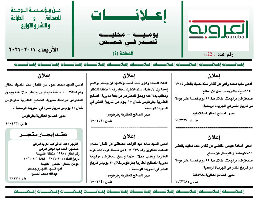 إعلانات العروبة إعلانات آخر تحديث 11 شباط , 2026 شارك FacebookWhatsAppFacebook MessengerTelegramTwitter