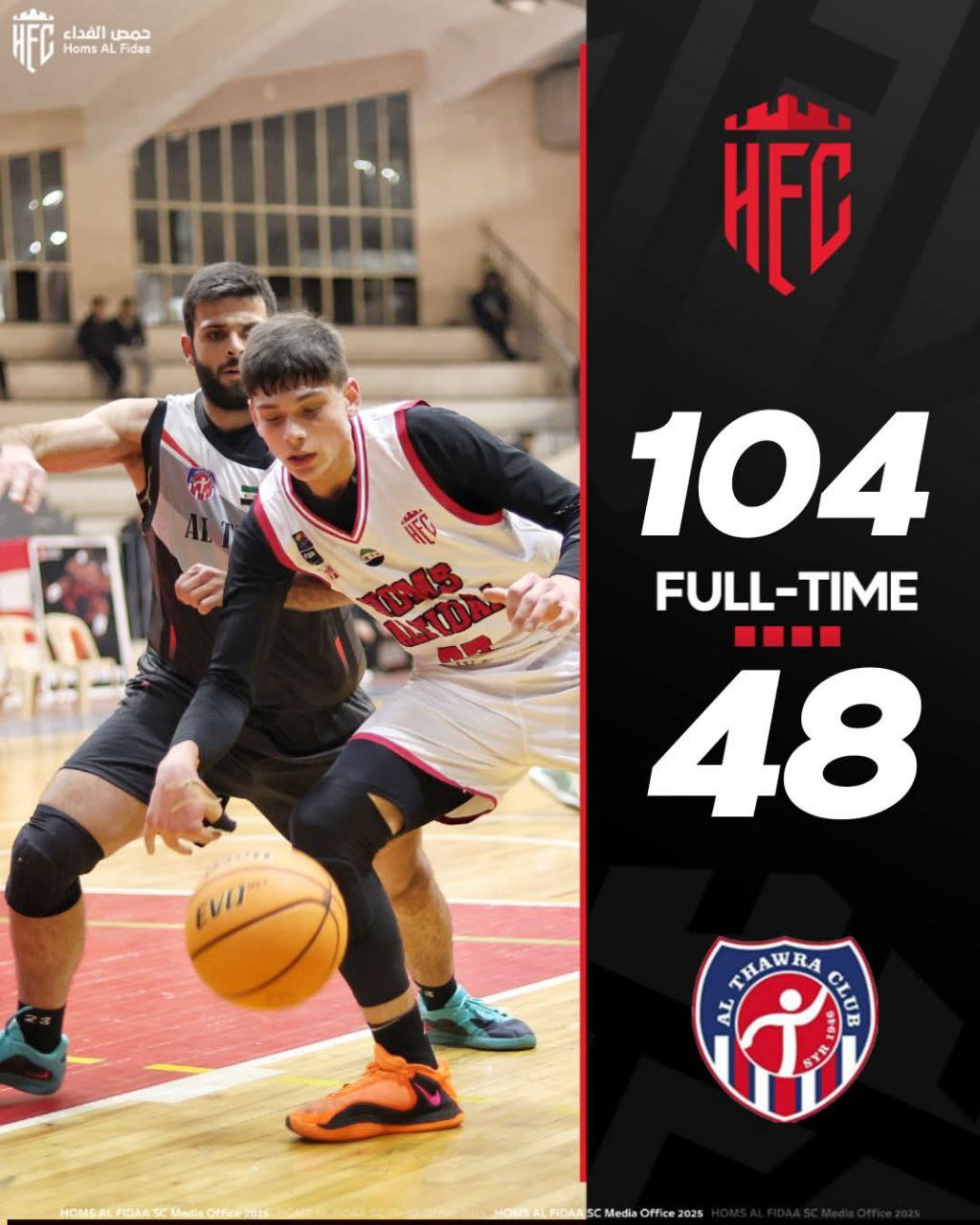 حقق فريق حمص الفداء لكرة السلة فوزه الثالث في الدوري على حساب فريق الثورة، بعد أن تمكن من الفوز عليه بفارق 54 نقطة في المباراة التي جمعت الفريقين على صالة غزوان أبو زيد، ضمن منافسات الجولة السادسة من الدوري.