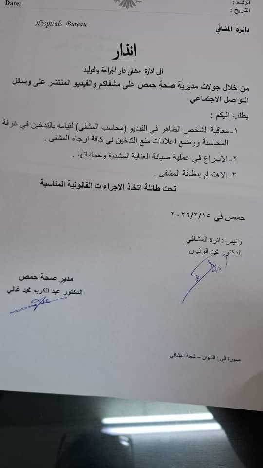 أصدرت مديرية صحة حمص إنذاراً رسمياً لمشفى دار الجراحة والتوليد، عقب تداول مقطع مصوّر أظهر مخالفات داخل المشفى وأثار تفاعلاً واسعاً على وسائل التواصل الاجتماعي.