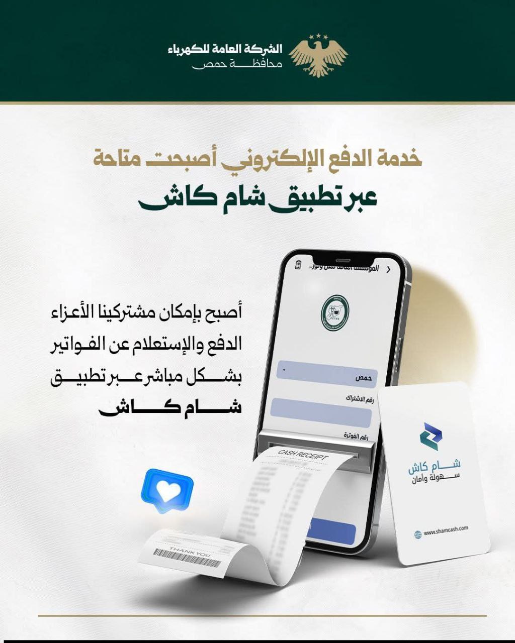 أعلنت الشركة العامة لكهرباء محافظة حمص إمكانية تسديد فواتير الكهرباء والاستعلام عنها إلكترونياً عبر تطبيق «شام كاش».