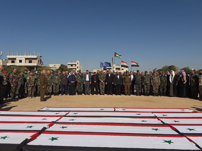 وخلال التشييع تحدث العميد حسن أحمد رئيس فرع التوجيه السياسي في قيادة المنطقة الوسطى فقال : بكبير فخر وعظيم أجر نشيع اليوم كوكبة من شهداء الوطن إلى مثواهم الأخير هؤلاء الأبطال ارتقوا حفاظا على منجزات التصحيح عندما دمر الإرهاب منشآتنا ليعيدنا أعواما للوراء ولكن بفضل تضحيات أبطالنا صمدنا وانتصرنا فالقداسة لأرواحهم الطاهرة والشكر لعوائلهم الكريمة التي قدمت للوطن أغلى ما تملك ليبقى عزيزا شامخا , وأضاف إن كان هؤلاء الأبرار مجهولي الهوية فيشرفنا أن نكون أهلهم وذويهم فهم باتوا نجوما تضيء الدرب للأجيال القادمة وسورية منتصرة بفضل صمود شعبنا وبطولة جيشنا وحكمة قائدنا.