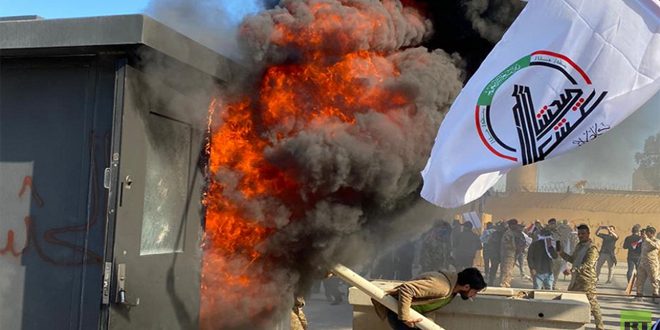 واقتحم آلاف المتظاهرين من مشيعي شهداء الحشد الشعبي بوابة “المنطقة الخضراء” وحاصروا السفارة الأمريكية وأحرقوا إحدى بواباتها وكتبوا على جدرانها “مغلقة بأمر الشعب” ثم شرعوا ببناء خيم اعتصام أمام المبنى كما أحرقوا مرآب السفارة وفق ما أفاد مصدر أمني.
