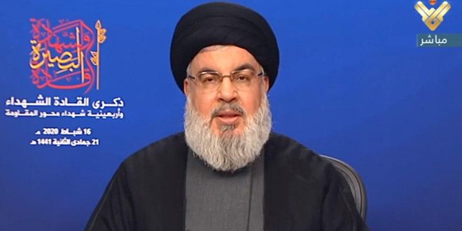 وقال السيد نصر الله “نحن أمام مواجهة جديدة لا مفر منها لأن الطرف الآخر يهاجم ويبادر ويقتل ويشن الحروب” مشيرا إلى أنه ليس أمام شعوب المنطقة في مواجهة العدوان الأمريكي المتعدد والمتنوع إلا خيار المقاومة الشاملة والشعبية في كل أبعادها الثقافية والاقتصادية والسياسية والقضائية.