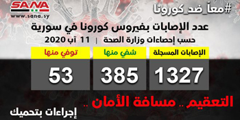 وأشارت الوزارة إلى أن حصيلة الإصابات المسجلة في سورية حتى الآن بلغت 1327 شفيت منها 385 وتوفيت 53 حالة.