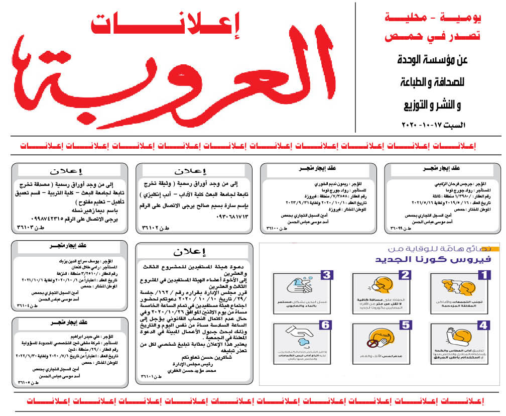 اعلانات العروبة إعلانات في 17 تشرين أول , 2020 شارك FacebookWhatsAppFacebook MessengerTelegramTwitter
