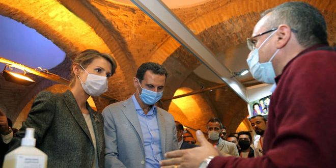 زار السيد الرئيس بشار الأسد والسيدة أسماء الأسد اليوم معرض “منتجين 2020” بالتكية السليمانية بدمشق الذي يشارك فيه منتجون من محافظة حلب تضررت منشآتهم وورشهم ومحلاتهم خلال فترة الحرب وعادوا للانطلاق والعمل والإنتاج بعزيمة وإرادة السوريين الذين يواجهون الحصار والعقوبات الجائرة ضد وطنهم.