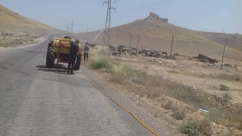 وذكر رئيس مصلحة زراعة تدمر أحمد يوسف أنه عند بدء مشاهدة الجراد الصحراوي في عدة مواقع بريف تدمر منذ الثامن عشر من الشهر الجاري تم إرسال التجهيزات اللازمة لمكافحته والحد من انتشاره إلى المناطق الزراعية حيث يتم استخدام المرشات المقطورة بجرارات والمرشات المحمولة على الظهر والمرش الميكروني إضافة إلى صهاريج المياه اللازمة مشيراً إلى أنه تركز انتشار أسراب الجراد الصحراوي في مواقع التليلة ووادي الأحمر على بعد نحو 17 كم شرق مدينة تدمر وفي مواقع أبو الفوارس والمثلث على بعد نحو 10 كم غرب المدينة باتجاه منطقة البيارات الغربية التي توجد فيها المزارع وحقول القمح والتي تبعد نحو 25 كم غرب المدينة.