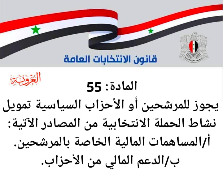 سورية تنتخب 2021 … الانتخابات الرئاسية 26 أيار .. أخبار العروبة في 12 أيار , 2021 من قانون الانتخابات العامة ..المادة: 55 يجوز للمرشحين أو الأحزاب السياسية تمويل نشاط الحملة الانتخابية من المصادر الآتية: أ/المساهمات المالية الخاصة بالمرشحين. ب/الدعم المالي من الأحزاب. شارك FacebookWhatsAppFacebook MessengerTelegramTwitter
