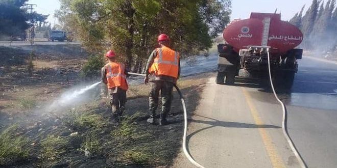 أخمد عناصر الدفاع المدني وإطفاء مديرية زراعة حمص حريقاً نشب بأعشاب يابسة وأشجار حراجية بريف حمص.