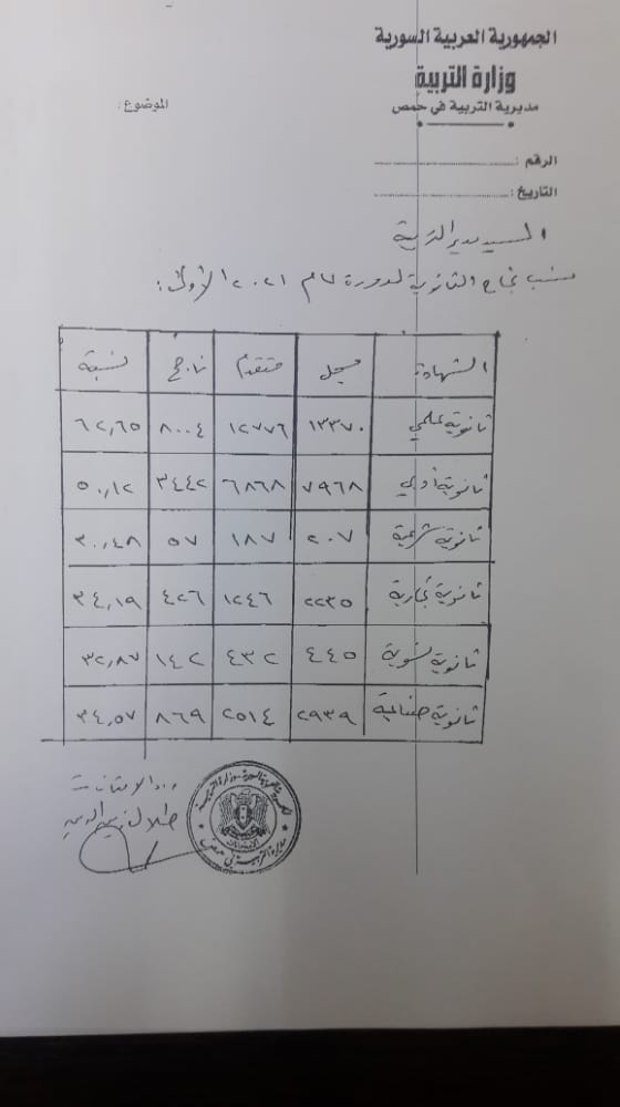 بلغت نسبة الطلاب الناجحين في الشهادة الثانوية الفرع العلمي في محافظة حمص 62،65 % حيث نجح 8004 طلاب من أصل 12776 متقدما بينما انخفضت النسبة للطلاب الناجحين بالفرع الأدبي إلى 50،12 % حيث نجح 3442 طالبا من أصل 6868 متقدما و في الثانوية الشرعية كانت نسبة النجاح 30،48 % و نجح 57 طالبا من 187 متقدما و في باقي الفروع كانت نسبة نجاح طلاب الثانوية التجارية في المحافظة 34،19 %و نجح 426 طالبا من أصل 1246 متقدما بينما كانت نسبة النجاح في الفرع النسوي 32،87 % حيث نجحت 142 طالبة من أصل 432 متقدمة و في الثانوية الصناعية سجلت نسبة نجاح 34،57 % نجح 869 طالبا من أصل 2514 طالبا متقدما.