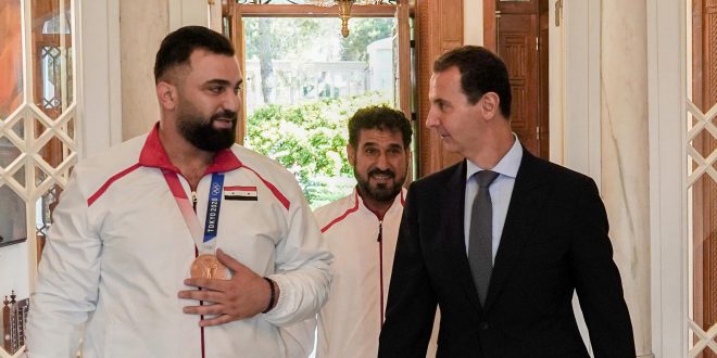 تقديراً لما حققه في أولمبياد طوكيو وحصوله على الميدالية البرونزية في رياضة رفع الأثقال، استقبل السيد الرئيس بشار الأسد اليوم الرباع معن أسعد ومدربه قيس أسعد ورئيس اتحاد رفع الأثقال حسنين الشيخ، وهنأهم بهذا الإنجاز وتمنى لهم النجاح في الاستحقاقات الرياضية القادمة.