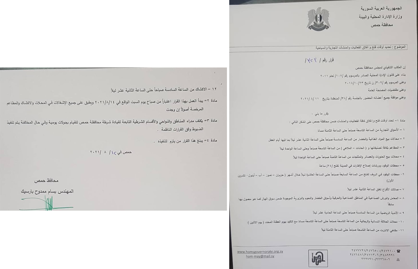 ■يبدأ العمل بهذا القرار اعتباراً من صباح اليوم السبت الواقع في 14/8/2021 ويطبق على جميع الإشغالات في المحلات والأكشاك والمطاعم المرخصة أصولاً إن وجدت.