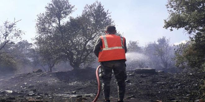 أخمد عناصر الدفاع المدني في حمص بالتعاون مع إطفاء مديرية الزراعة اليوم حريقا اندلع بأعشاب يابسة وبساتين زيتون في أراضي بلدة الكيمة في ريف حمص الغربي.