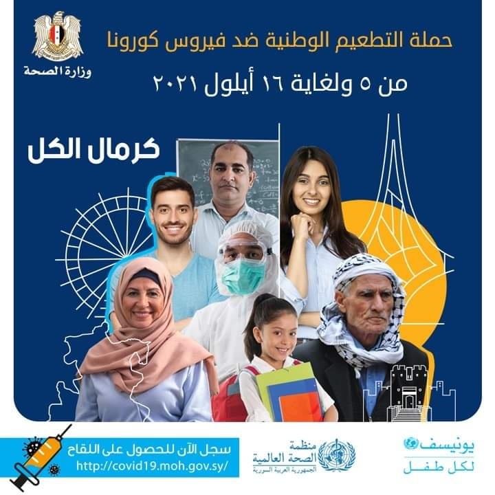 بدأت مديرية صحة حمص اليوم حملة تلقيح ضد فيروس كورونا وتستمر لغاية 16 أيلول .