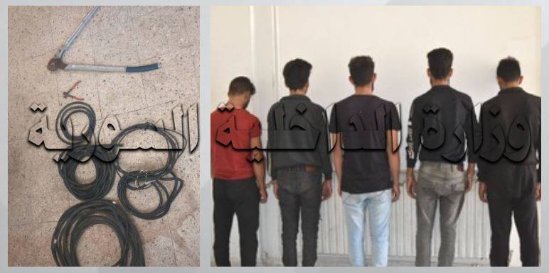 نتيجة المتابعة الحثيثة والعمل على المحافظة على الممتلكات العامة والخاصة وبعد ورود معلومات حول قيام أشخاص بسرقة الأكبال الكهربائية والهاتفية للشبكة العامة في قرية المشرفة والقرى المحيطة بها وبالتنسيق مع أهالي المنطقة وبعد نصب الكمين اللازم تمكن عناصر مخفر شرطة المشرفة التابع لناحية عين النسر من إلقاء القبض عليهم بالجرم المشهود وهم المدعو (هادي . ع) و(نيروز . أ) و(ربيع . أ) و(غدير . ك) و(حسن . ع) يقومون بقص الأكبال وضبط بحوزتهم مقص معدني كبير وقطاعة صغيرة وربطات من الأكبال الكهربائية المسروقة وبالتحقيق معهم اعترفوا بقيامهم بسرقة الأكبال الكهربائية والهاتفية من الشبكة العامة وبيعها لقاء المنفعة المادية وقيامهم بعدة عمليات سرقة سابقة من قرى ( بادو ، الجابرية ، اليمامة.(
