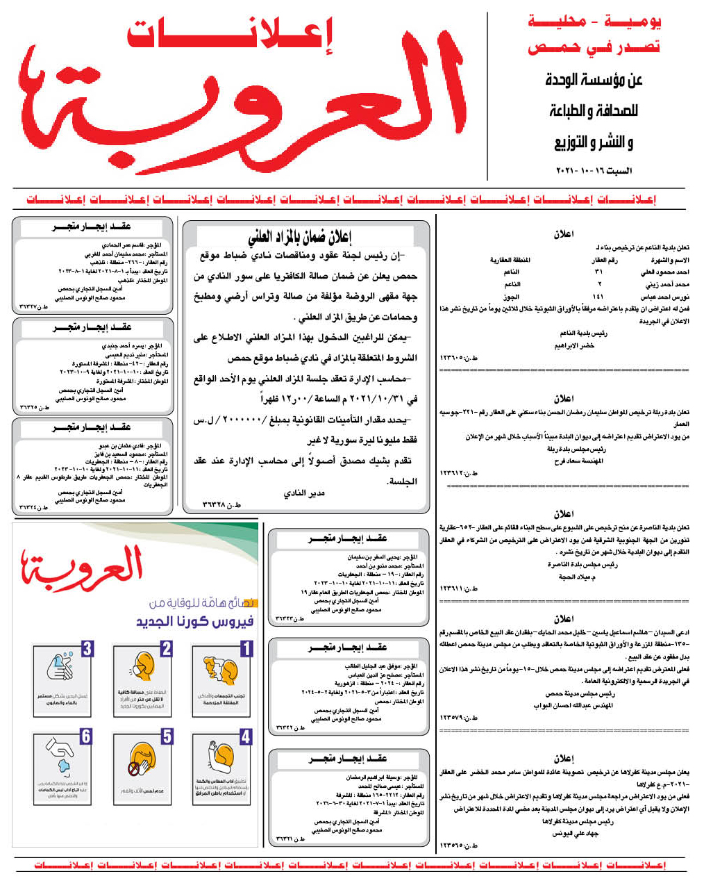 اعلانات العروبة إعلانات في 16 تشرين أول , 2021 شارك FacebookWhatsAppFacebook MessengerTelegramTwitter