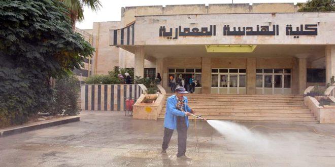 نفذت جامعة البعث حملة تعقيم لمباني الكليات والمعاهد وجميع المرافق والساحات فيها وذلك ضمن الإجراءات الاحترازية للوقاية من فيروس كورونا.