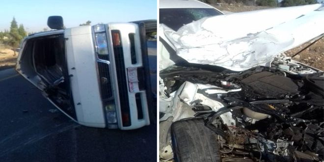 أصيب اليوم خمسة أشخاص بجروح طفيفة جراء تصادم سيارة سياحية مع سرفيس لنقل الركاب على طريق دمشق حمص.