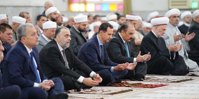 وأدى الصلاة مع الرئيس الأسد وزير الأوقاف وعدد من المسؤولين في الدولة والحزب وعدد من أعضاء مجلس الشعب ومجموعة من علماء الدين الإسلامي وجمهور من المواطنين مؤتمين بفضيلة الشيخ محمد بشار تركماني.وأكد الشيخ تركماني في خطبة العيد معاني الفطر السعيد من التعاضد والتراحم والتلاحم والتسامح مشيراً إلى أن العيد يأتي واعتداءات كيان الاحتلال الصهيوني على الأراضي الفلسطينية المحتلة والمقدسات الإسلامية والمسيحية تتواصل ولا سيما المسجد الأقصى وكنيسة القيامة.