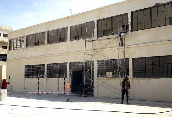 حوالي 400 تلميذ بدؤوا دوامهم بانتظام في مدرسة الملك أذينة بتدمر بعد الانتهاء من عمليات الترميم لكتلتين من أصل ثلاث تضم 16 قاعة صفية إضافة لثلاث غرف إدارية, و ذكر رئيس دائرة الأبنية المدرسية في “تربية حمص ” المهندس عبدالله مغربل أن أعمال إعادة التأهيل للمدرسة شملت كتلتي البناء الغربية و الشرقية و التي تضمنت إضافة لتأهيل الغرف الصفية و الإدارية تأهيل دورات المياه و المشارب و صيانة المقاعد و الأثاث المدرسي ، مشيراً أن العمل جار حالياً لتأهيل ثانوية محمود مطلق و التي تتضمن ترميم الطابق الأرضي المؤلف من ست شعب صفية وغرفتي إدارة إضافة لعمليات ترميم و إعادة بناء السور المهدم .