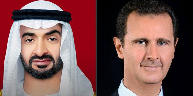 هنأ السيد الرئيس بشار اﻷسد في برقية الشيخ محمد بن زايد آل نهيان بانتخابه رئيساً لدولة الإمارات العربية المتحدة جاء فيها..