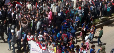 نظمت الفعاليات الرسمية والأهلية في محافظة القنيطرة وقفة احتجاجية في بلدة جبا رفضا لإعلان الرئيس الامريكي دونالد ترامب حول الجولان السوري المحتل.