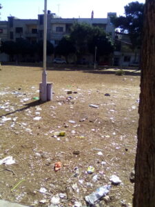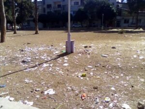 منظرها يبعث على الحزن والألم الذي يصاب به المرء من أول نظرة للواقع الذي آلت إليه هذه الحديقة ذات التربة الجرداء المليئة بمختلف أشكال وأنواع القمامة في الوقت الذي يجب أن تكون مليئة بمختلف أنواع وأشكال الأزهار والورود والشجيرات .
