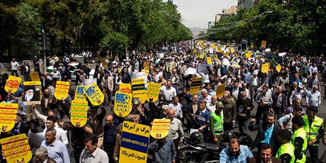 شهدت العديد من المدن الإيرانية اليوم مسيرات حاشدة دعماً لقرار إيران خفض التزاماتها حيال الاتفاق النووي الموقع معها وذلك رداً على الانسحاب الأمريكي من الاتفاق والإجراءات الأمريكية الجائرة بحق الشعب الإيراني.