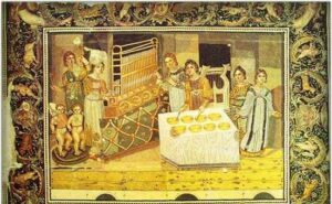 ويؤكد الباحث أن أهم المكتشفات العائدة لهذه الفترة هو اللوحة الفسيفسائية التي استُخرجت من الحي الجنوبي للقرية في نهاية ستينات القرن الماضي وهي موجودة الآن في متحف حماة الوطني، وتبلغ أبعادها(٥،٣٧ م×٤،٢٥م) وتعود إلى القرن الثالث الميلادي(الفترة الرومانية) وتعتبر من أجمل لوحات الفسيفساء في العالم لِصغَر مكعباتها ومساحتها الكبيرة والدقة والمهارة في التصميم والتنفيذ وموضوعها الذي يمثل حفلة موسيقية تظهر فيها الراقصة وضابطة الإيقاع وعازفات على آلات موسيقية مختلفة من سائر أنحاء العالم القديم بما فيها الآلات الإغريقية والهندية ….ويظهر على يمين اللوحة أيضاً ملاكان على شكل طفلَين مجنحين، أما على أطرافها فتظهر مشاهد صيد وأساطير وصور آلهة متعددة….