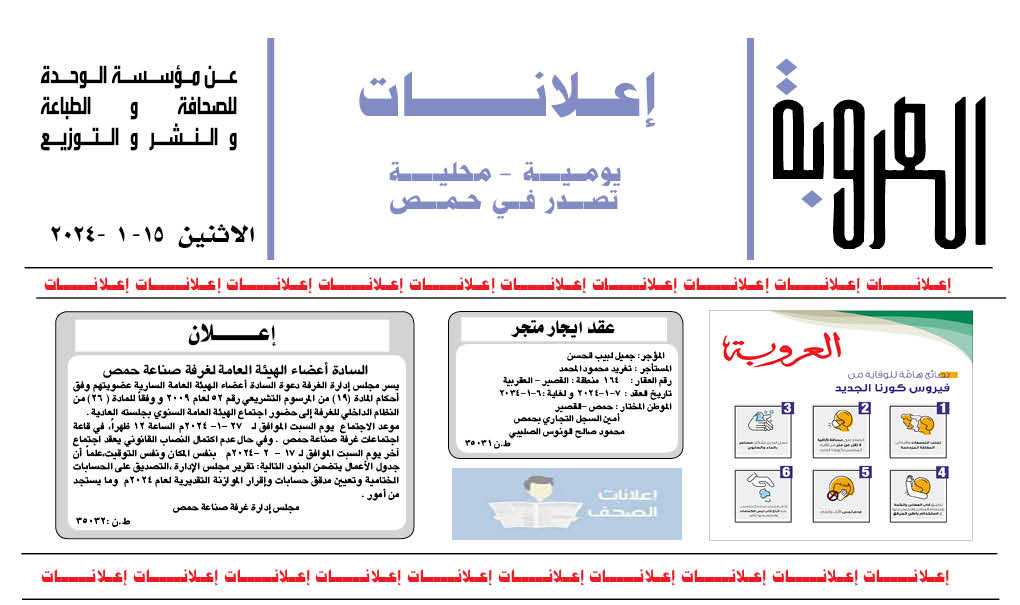 إعلانات العروبة إعلانات في 15 كانون الثاني , 2024 شارك FacebookWhatsAppFacebook MessengerTelegramTwitter