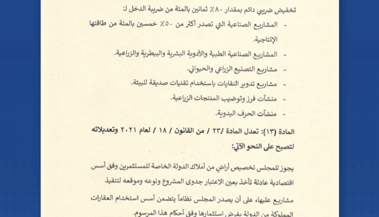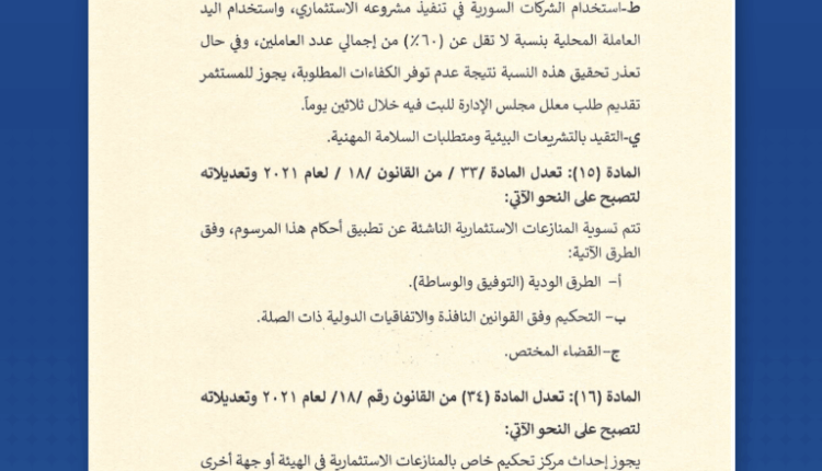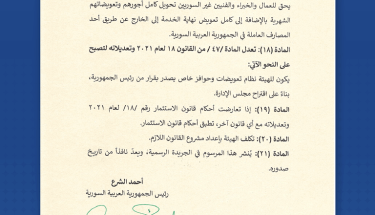 الرئيس الشرع يصدر مرسوماً بتعديل بعض مواد قانون الاستثمار أحدث الأخبارأخبار العروبةرئيسي في 9 تموز , 2025 أصدر السيد الرئيس أحمد الشرع المرسوم رقم (114) لعام 2025 القاضي بتعديل بعض مواد قانون الاستثمار رقم 18 لعام 2021 وتعديلاته. وتعديلاته. شارك FacebookWhatsAppFacebook MessengerTelegramTwitter