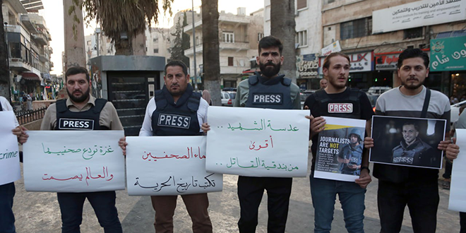 نظم صحفيون وإعلاميون سوريون اليوم، وقفات تضامنية في عدد من المحافظات للتعبير عن وقوفهم إلى جانب الصحفيين الفلسطينيين في قطاع غزة، وتنديداً بالجرائم التي يرتكبها الاحتلال الإسرائيلي بحقهم، والتي كان آخرها استهداف طاقم قناة الجزيرة فجر اليوم وصحفيين آخرين، ما أدى إلى استشهاد عدد منهم.