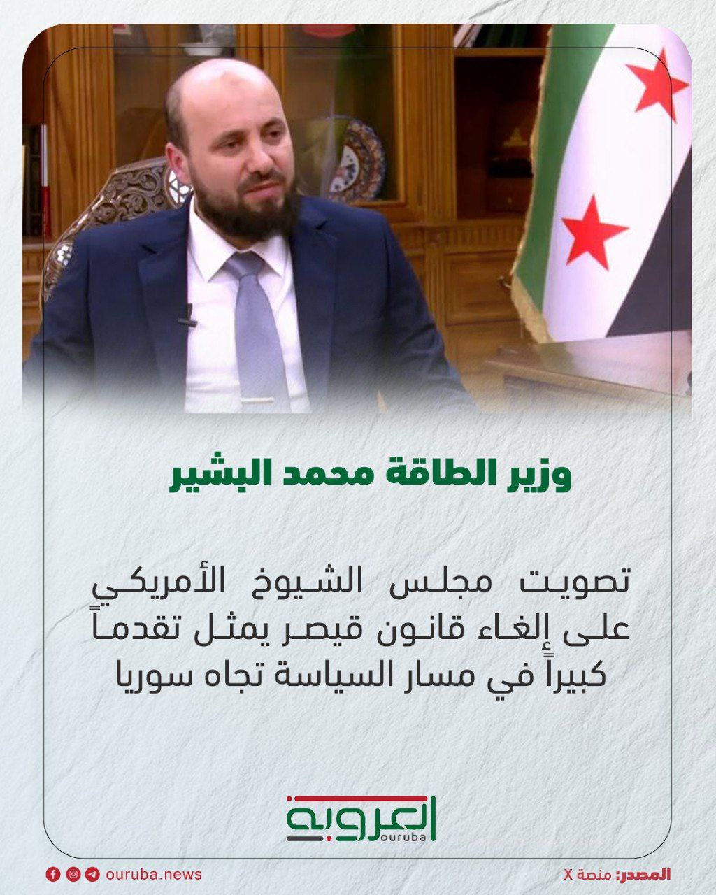 أكد وزير الطاقة محمد البشير أن تصويت مجلس الشيوخ الأمريكي لصالح إلغاء قانون قيصر يمثل تقدماً كبيراً في مسار السياسة تجاه سوريا.