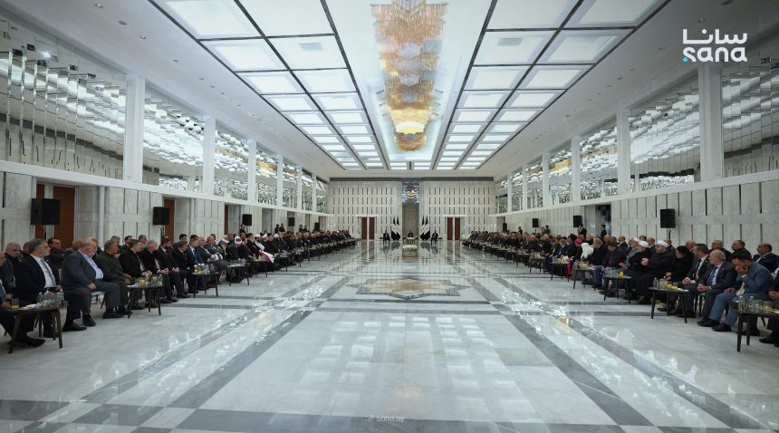 التقى الرئيس أحمد الشرع اليوم في قصر الشعب بدمشق، وجهاء وأعيان محافظتي اللاذقية وطرطوس، بحضور محافظ اللاذقية محمد عثمان ومحافظ طرطوس أحمد الشامي.