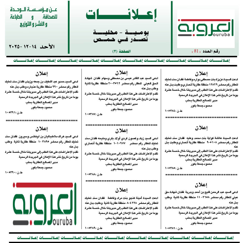إعلانات العروبة إعلانات في 14 كانون أول , 2025 شارك FacebookWhatsAppFacebook MessengerTelegramTwitter
